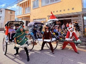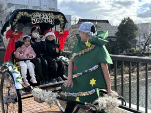 3人ずつクリスマスの装飾が施された人力車に乗車しました。
